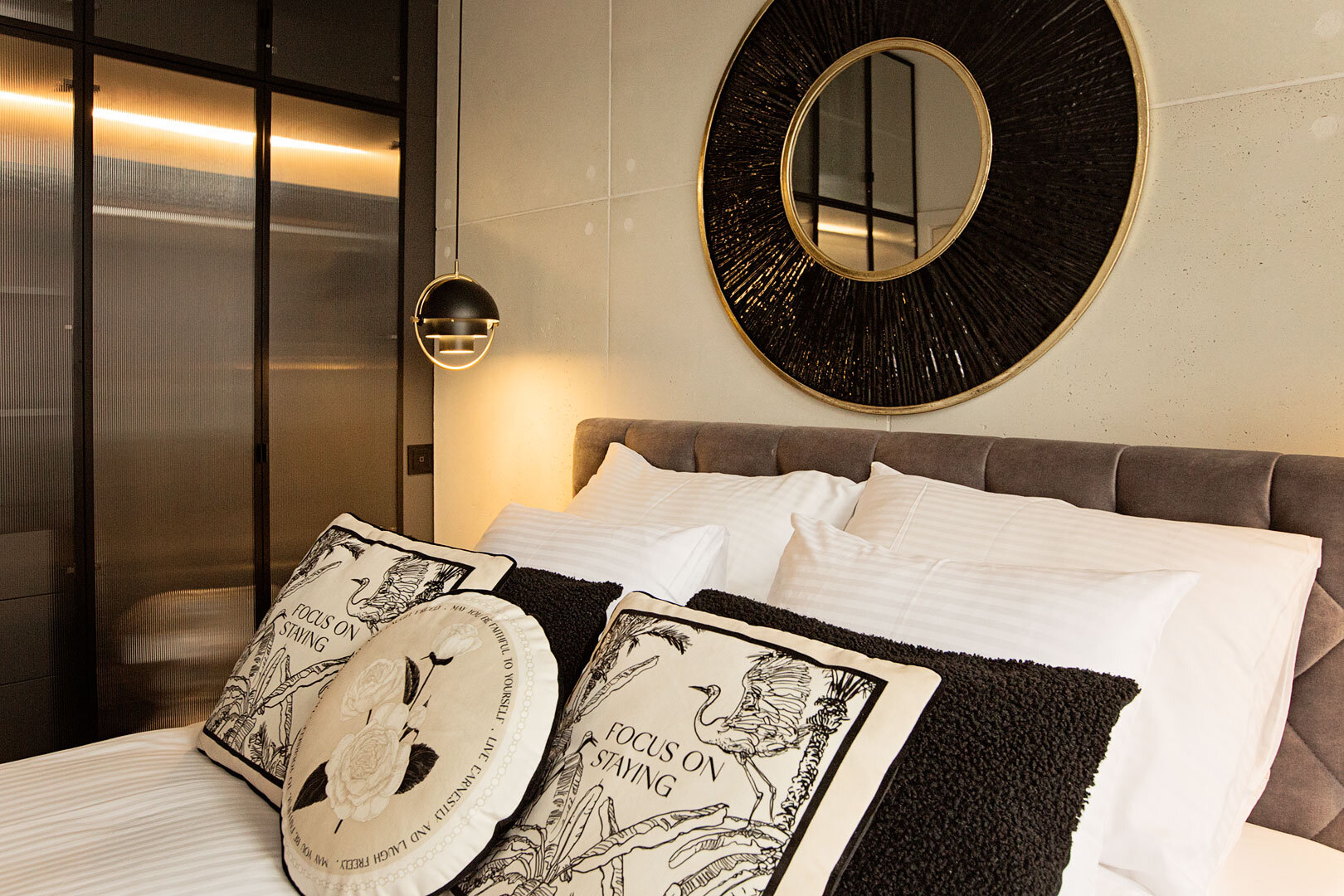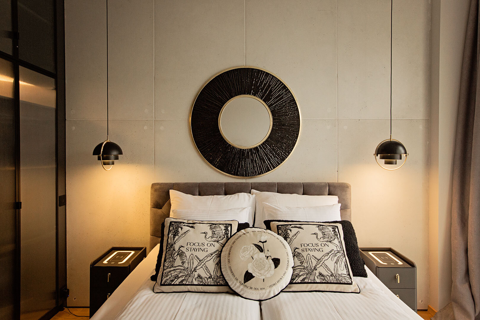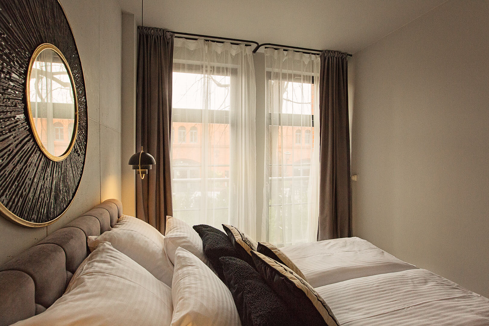 Das Husarski Apartment ist im Industriestil eingerichtet. Es ist mit originalen und maßgefertigten Designermöbeln und Ausstattungselementen, wie z. B. Beleuchtung, ausgestattet.